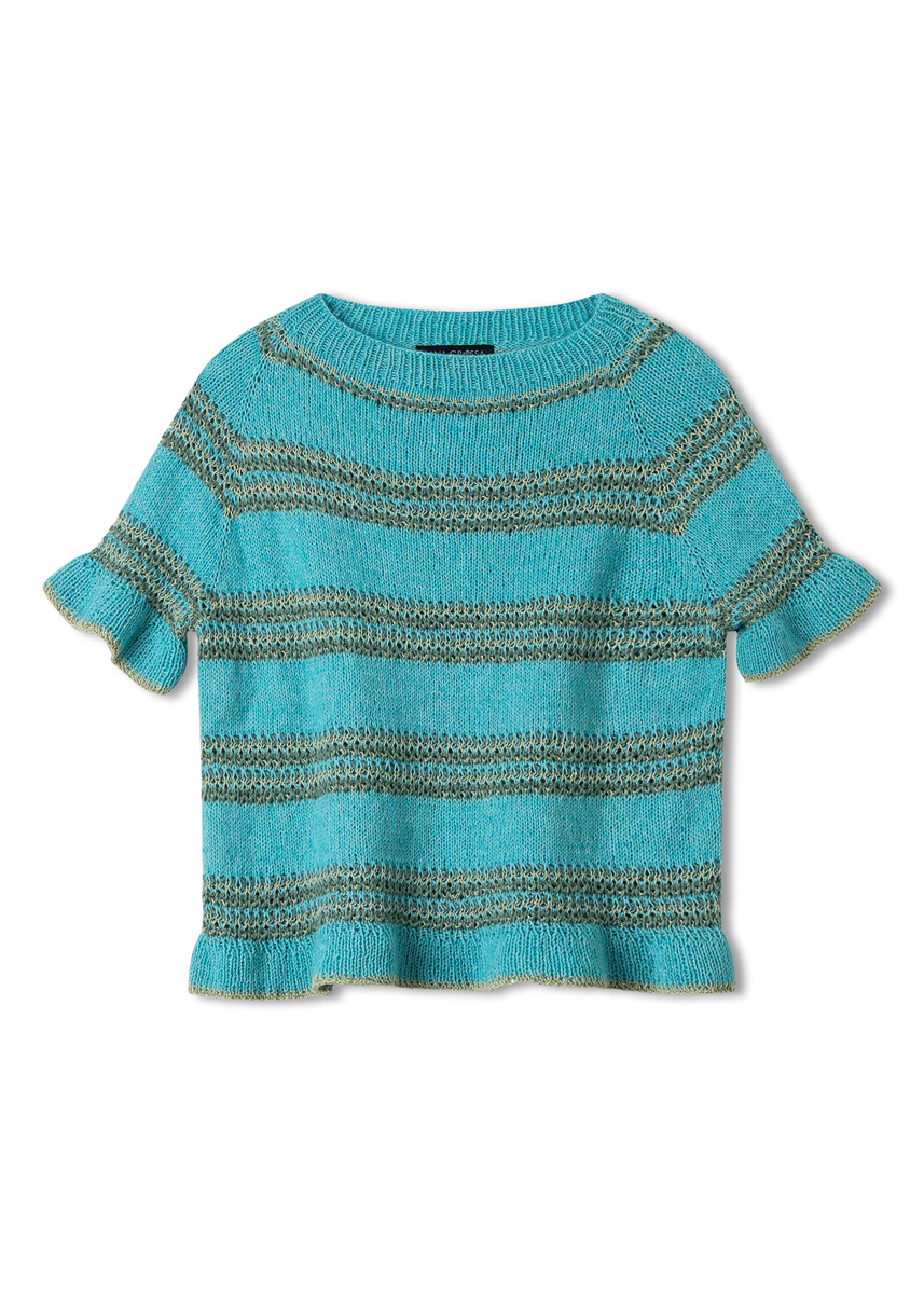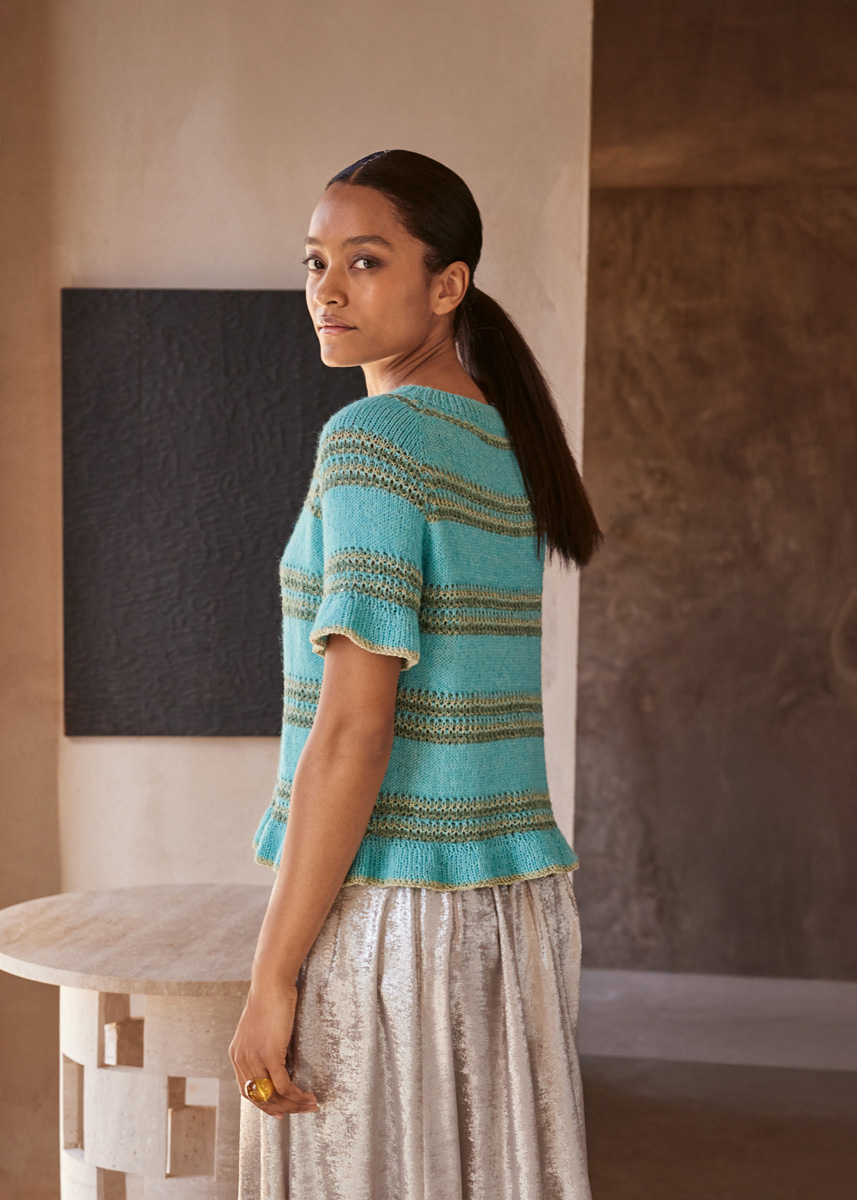 Lana Grossa Ecopuno (72% bomull, 17% ren ny ull (merino), 11% alpakka (baby), løpelengde = ca. 215 m/50 g), 150 (200 - 200) g i tyrkis (farge 28), Lana Grossa Tencellino (51% lin, 49% Tencel, løpelengde = ca. 125 m/50 g), 100 g i jadegrønn (farge 8). Lana Grossa Filo Paillettes (55% bomull, 39% polyester, 6% polyamid, løpelengde = ca. 155 m/50 g), 100 g i limette (farge 12). 60 cm, 80 cm og 100 cm eller 120 cm lange rundpinner nr. 4; 5 settpinner nr. 4. 8 maskemarkører [MM] Tips: For omgangens begynnelse anbefales det å bruke en maskemarkør i en annen farge eller design, slik at starten på omgangen alltid er lett å kjenne igjen.