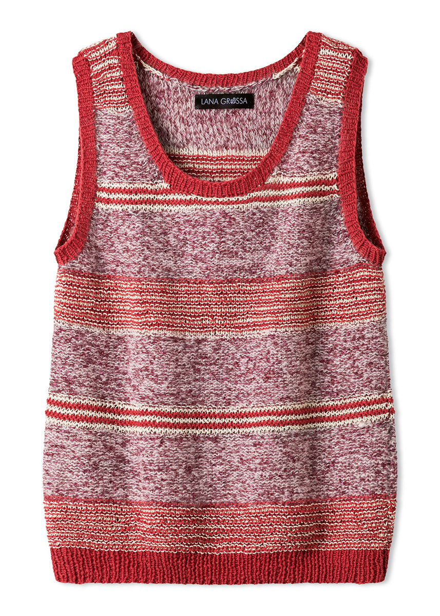 Lana Grossa-kvalitet ”Summer Cashmere” (90 % bomuld, 10 % kashmir, løbelængde ca. 210 m/50 g): ca. 50 (100 - 100 - 150) g orientrød (farve 25); Lana Grossa-kvalitet ”Setasuri” (69 % alpaka (Suri), 31 % silke, løbelængde ca. 212 m/25 g): ca. 50 (50 - 75 - 75) g creme (farve 2); Lana Grossa-kvalitet ”Filo Lurex” (94 % bomuld, 6 % polyester, løbelængde ca. 145 m/50 g): ca. 50 (50 - 100 - 100) g creme (farve 2); Lana Grossa-kvalitet ”Glamour” (55 % polyamid, 45 % polyester, løbelængde ca. 115 m/25 g): ca. 50 (75 - 75 - 100) g bordeaux (farve 9); Strikkepinde nr. 3 og 4; 1 kort rundpind nr. 3.