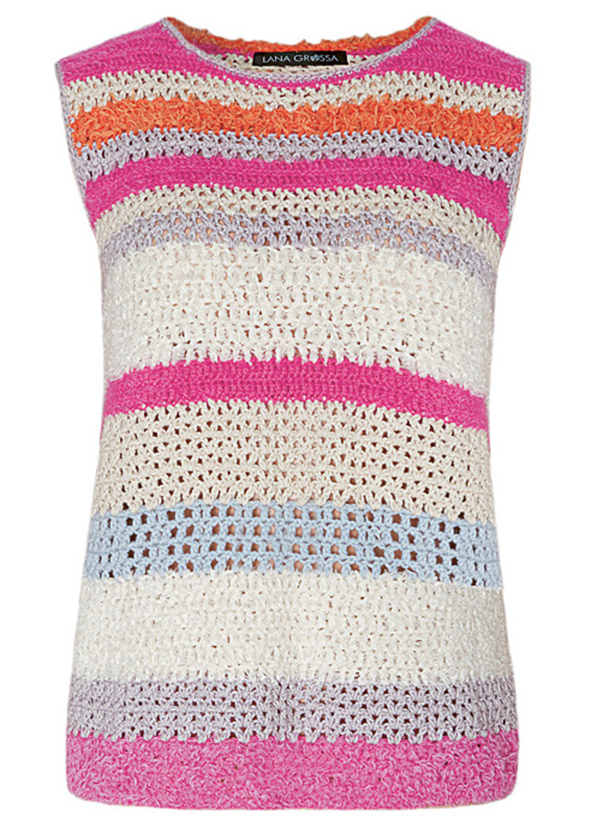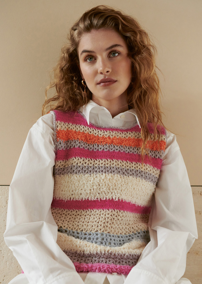 Lana Grossa-kvalitet „Fourseason“ (45 % bio ren ny ull (merino extrafin), 40 % bio bomull, 15 % återvunnen kashmir, löplängd 105 m/50 g): ca. 50 g ljus blå (färg 1), Lana Grossa-kvalitet „Brigitte No. 4“ (80 % bomull, 20 % (baby) alpacka, löplängd 110 m/50 g): je ca. 100 g bleklila (färg 7) och råvit (färg 1), Lana Grossa-kvalitet „Per Fortuna“ (74 % bio bomull, 26 % polyamid, löplängd 190 m/50 g): ca. 50 (100) g pink (färg 3) och Lana Grossa-kvalitet „About Berlin Funky“ (83 % bomull, 17 % polyamid, löplängd 130 m/50 g): ca. 100 (150) g Creme (färg 2) och ca. 50 g var pink (färg 17) och orange (färg 15); ullvirknålar nr. 4 och 4,5.