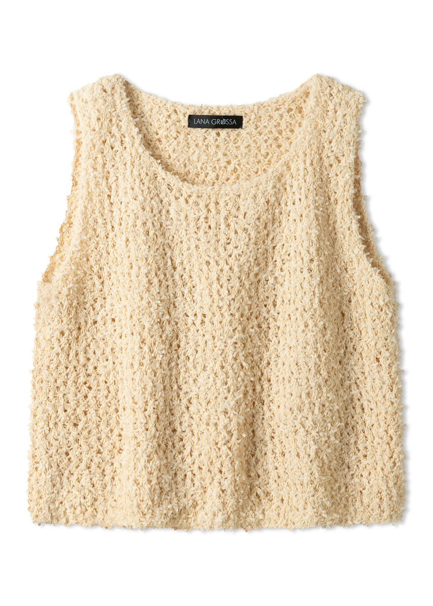 Garn: Lana Grossa «Frizzante» (54 % bomull, 46 % polyamid, LL = ca. 105 m/50 g): Ca. 200 (200 - 250 - 250) g krem (frg 1). Pinner/heklenål: Pinner nr. 5, heklenål nr. 5.