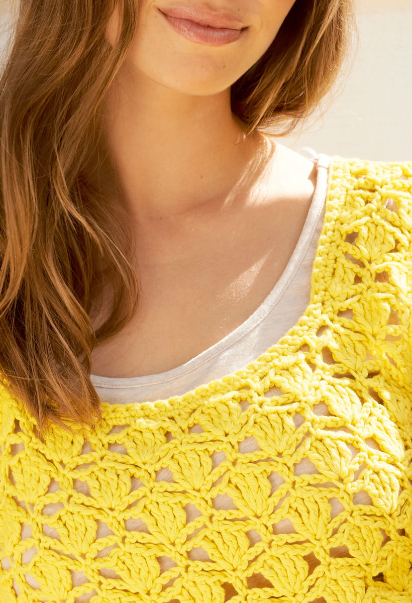 Lana Grossa-kvalitet ”Organico” (100 % bomuld, løbelængde = 90 m / 50 gr.): ca. 300(350) gr. gul (fv. 54), hæklenål nr. 5.