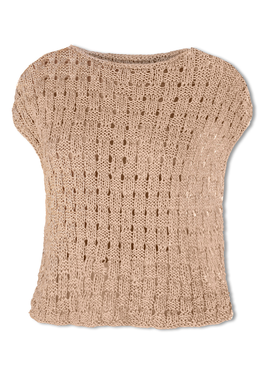 Lana Grossa Tencellino (51% lin, 49% Tencel, løpelengde = ca 125 m/50 g), 250 (300 - 300 - 350) g i lysblå (farge 10) og 250 (300 - 300 - 350) g i beige (farge 3). strikkepinner nr. 6. Kort rundpinne nr. 5.