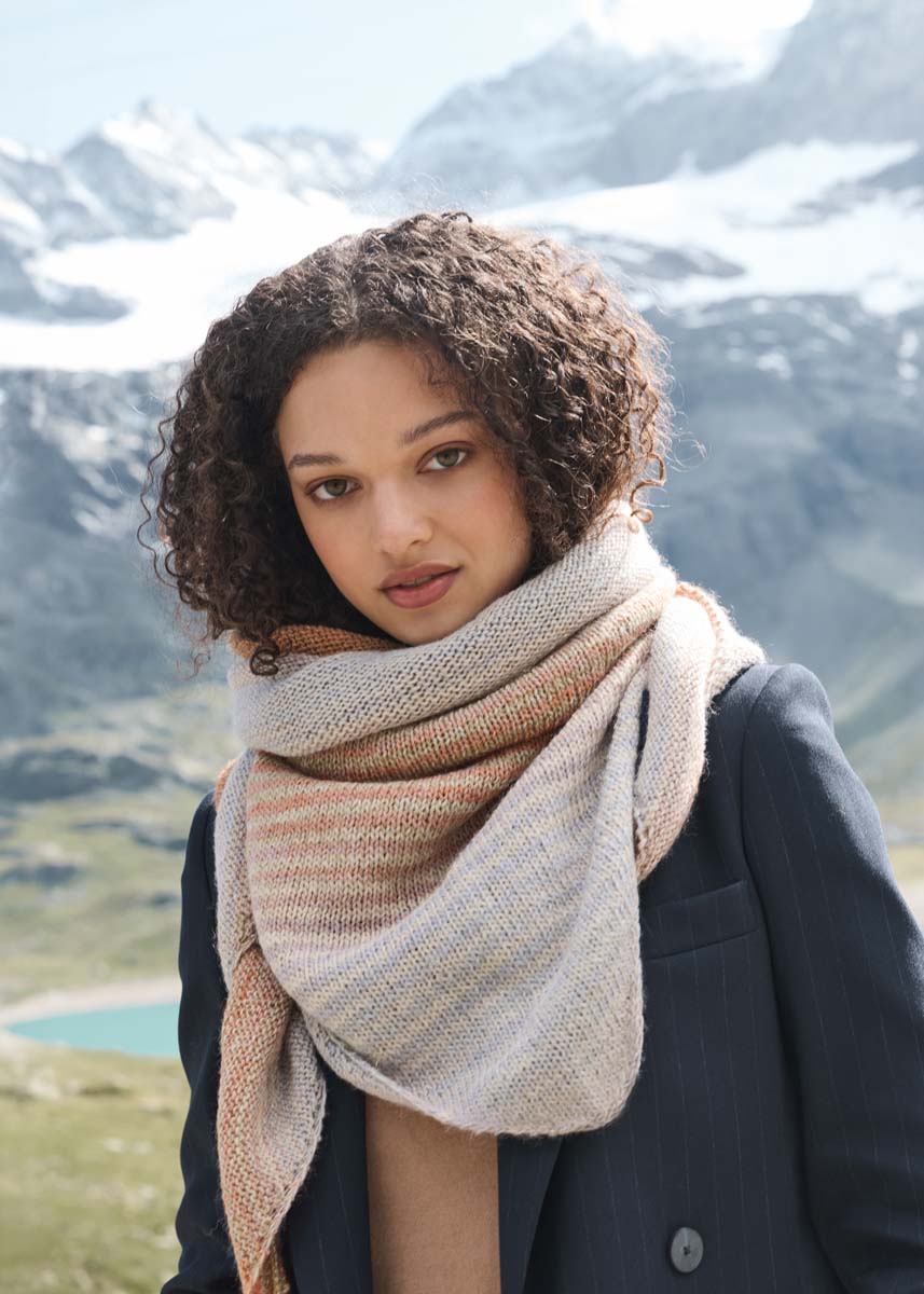 Lana Grossa-kvalitet „Gomitolo Gala“ (60 % ren nyuld, 38 % polyacryl, 2 % polyester løbelængde = ca 700 m/200 g): 1 nøgler = ca 200 g sandbeige/gråbeige/rust/orange/grønorange/khaki/sivgrøn/lysbeige (farve 4028); lange rundpinde nr. 5; heklenål nr. 5. Det trekantede tørklæde strikkes skiftevis 2 p med trådenden fra indersiden af nøstet og 2 p med trådenden fra ydersiden.