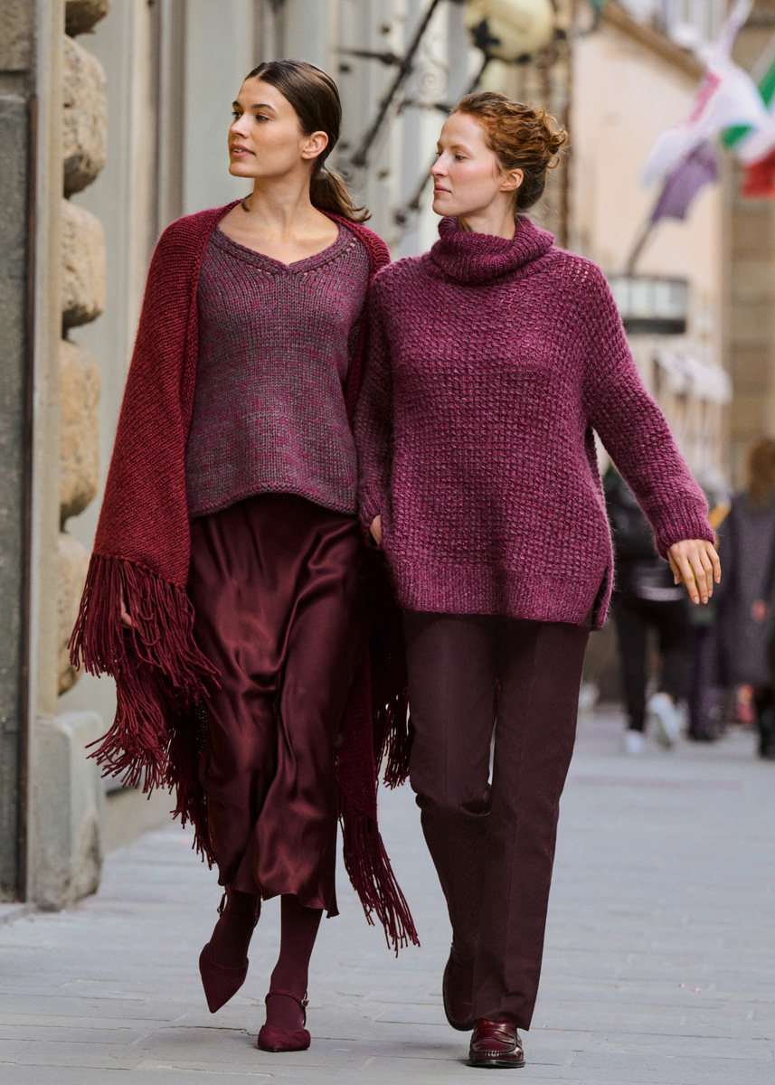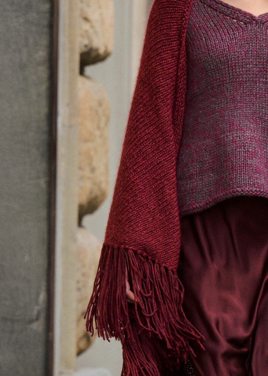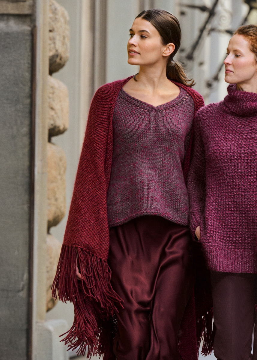 Lana Grossa-kvalitet ”Silkhair” (70% mohair (superkid), 30% silke, løbelængde = ca. 210 m / 25 gr.): ca. 100 gr bordeaux (fv 113) og Lana Grossa-kvalitet ”Alta Moda Alpaca” (90% alpaka (baby), 5% ren ny uld (merino), 5% polyamid, løbelængde = ca. 140 m / 50 gr.): ca. 500 gr burgunder (fv 94), en lang rundpind nr. 7 og 8, hæklenål nr. 7.