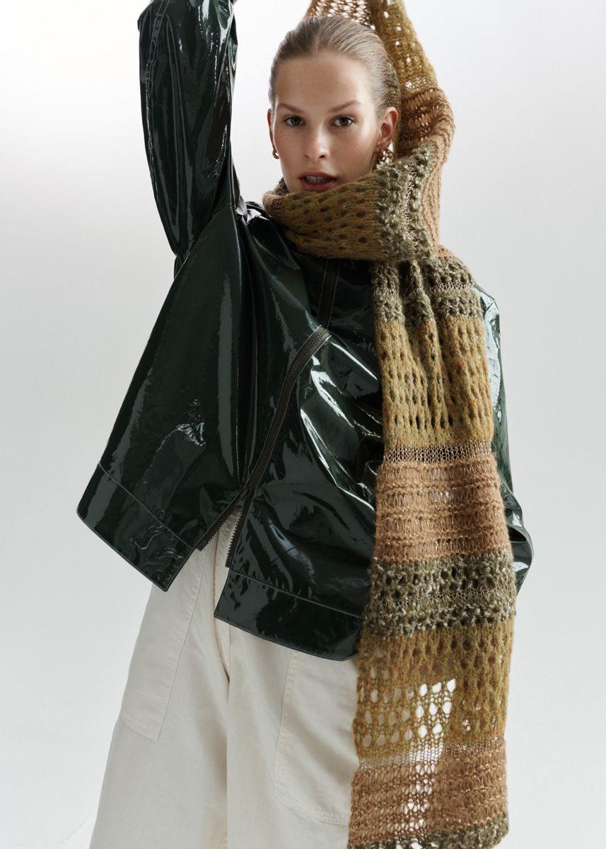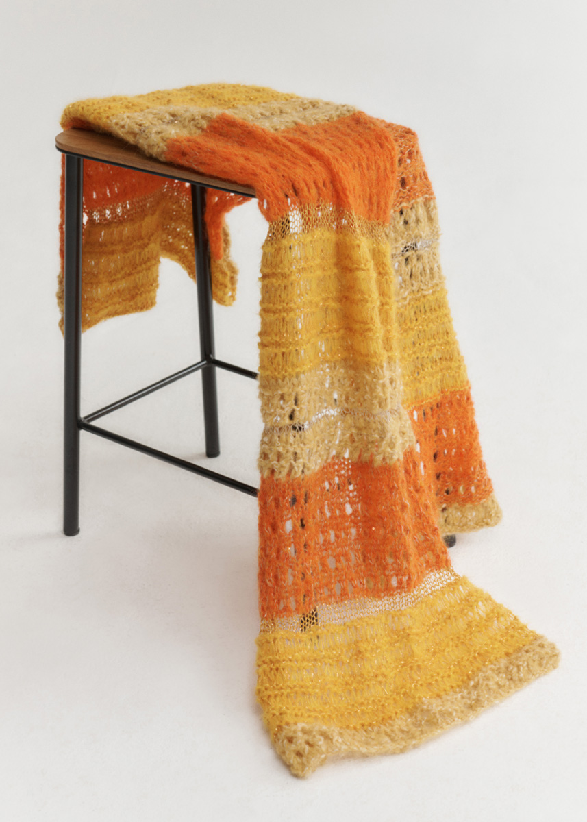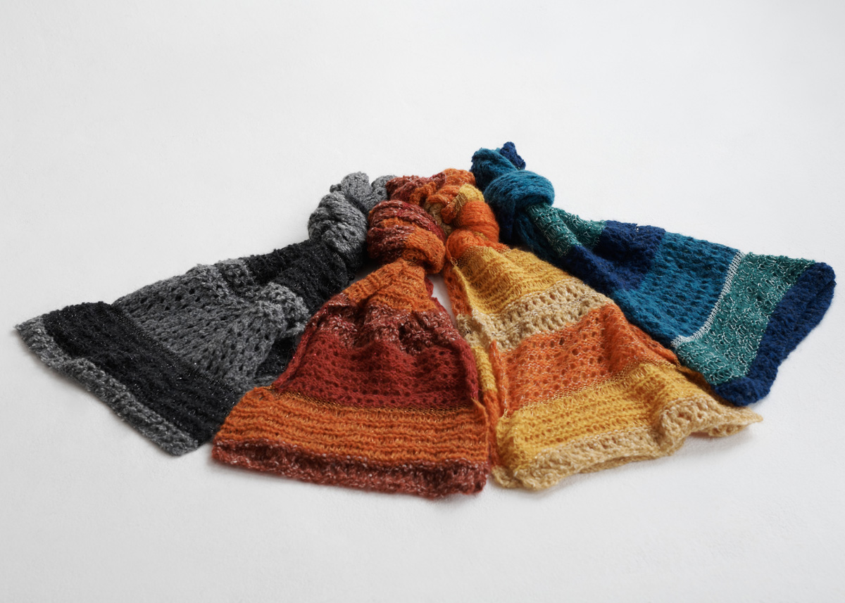 Lana Grossa-kvalitet ”Lala Berlin Harmony” (56 % (baby) alpaka. 20 % bomuld, 14 % polyamid, 10 % ren ny uld (merino). Løbelængde = ca. 150 m / 100 gr), Lana Grossa-kvalitet ”Nuvoletta” (42 % (baby) alpaka, 42 % ren ny uld (ekstrafin merino), 16 % polyamid. Løbelængde = ca. 250 m / 50 gr), Lana Grossa-kvalitet ”Brillino” (83 % viskose, 17 % metalliske fibre, løbelængde = ca. 200 m / 25 gr.) og Lana Grossa-kvalitet ”Diamante” (100 % polyester. Løbelængde = ca. 195 m / 25 gr).