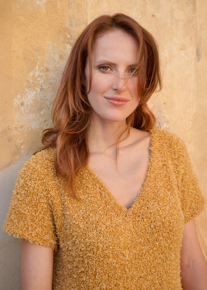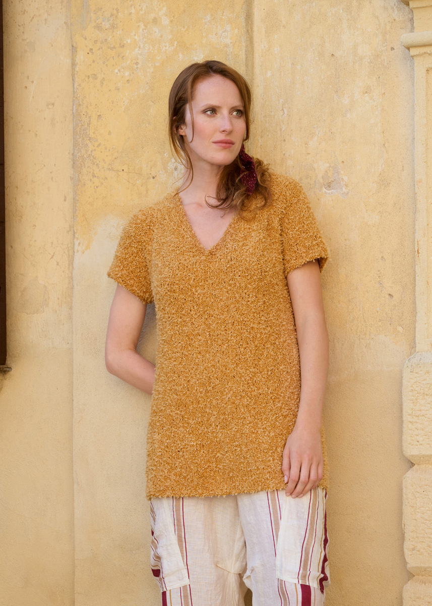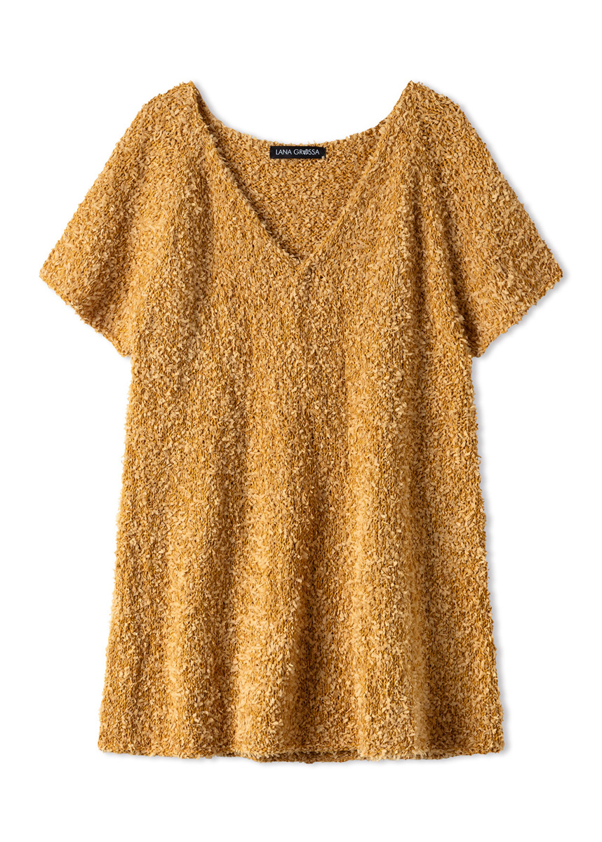 Lana Grossa-kvalitet “Frizzante” (54 % bomuld, 46 % polyamid, løbelængde = ca. 105 m/50 g): ca. 350 (400 - 450 - 500) g okkergul (farve 2), kort og lang rundpind nr. 5, maskemarkører; en snoningspind, hæklenål nr. 5.