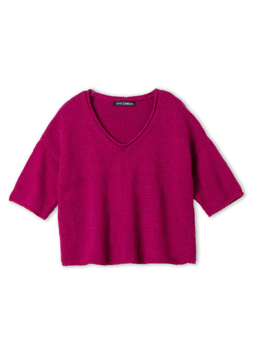 Lana Grossa-kvalitet „Summer Softness“ (80 % bomull (bio), 20 % ren ny ull (merino superfine), løpelengde = ca 130 m/50 g): ca 300 (300 - 350 - 350) g fuchsia (farge 27); pinner nr. 5 og nr. 6. 1 kort rundpinne nr. 5.