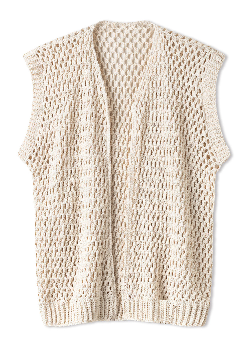 Lana Grossa-kvalitet “Gioia” (75 % bomuld, 25 % polyamid (genanvendt), løbelængde ca. 110 m/50 g): ca. 400 (400 - 450 - 450) g creme (farve 2); hæklenål nr. 4.