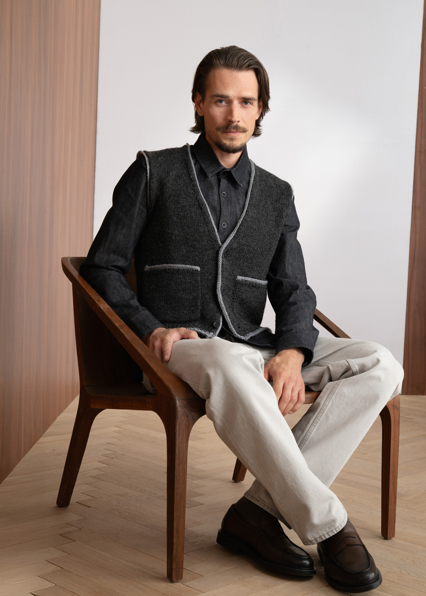 Lana Grossa Landlust naturwolle (100% (Norwegische) ren ny ull, løpelengde 85 m/50 g), 400 (450 – 500) g antrasitt (farge 10) og 50 g grå (farge 9); strikkepinner nr. 5, rundpinner nr. 4,5, 40 og 100 cm lang, såvel som 3 knapper fra UNION KNOPF, Art. 451992, farge 80, Ø 18 mm.