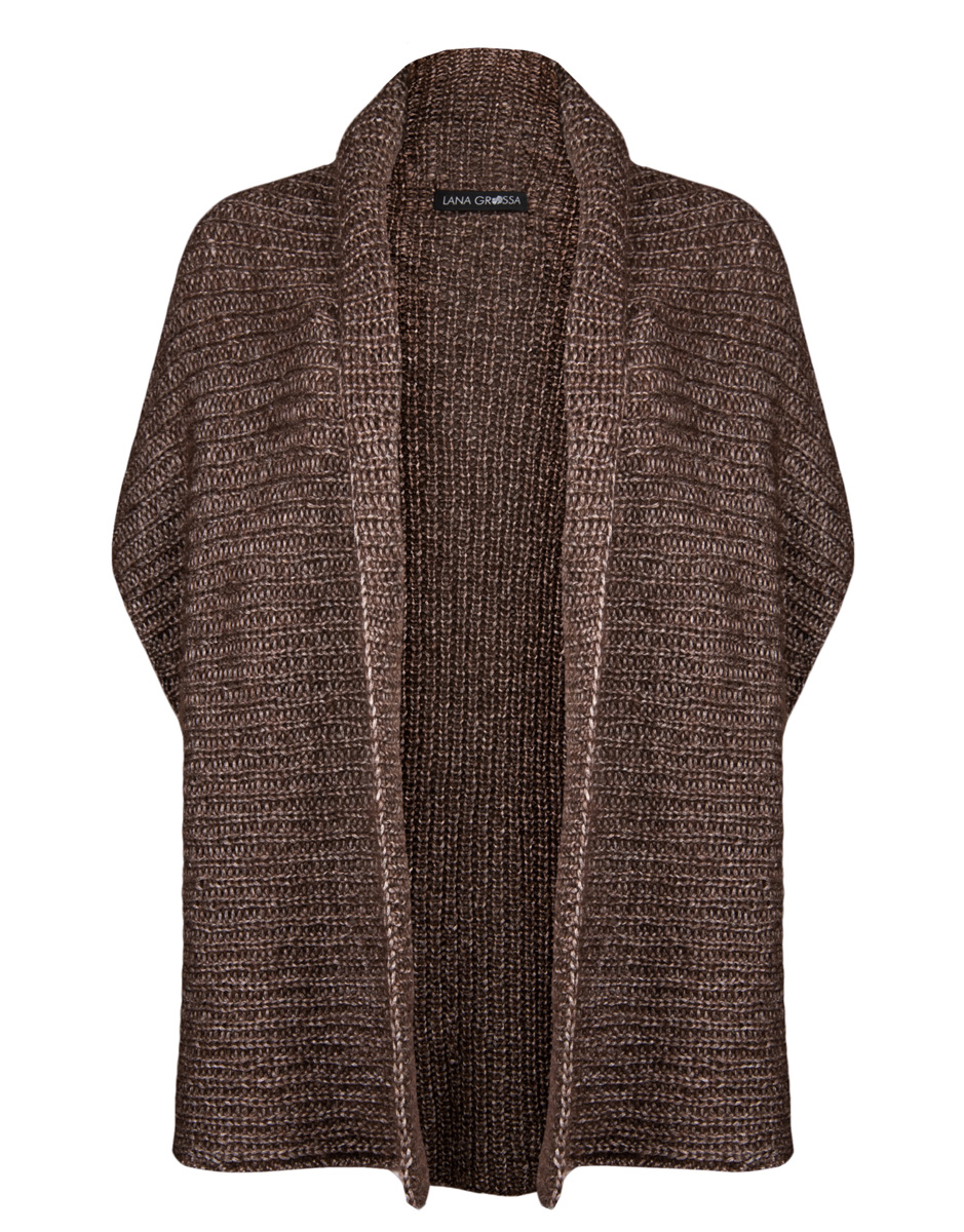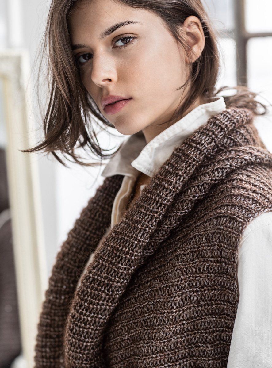 Lana Grossa-kvalitet „Mia“ (30 % mohair, 26 % ren ny uld, 25 % silke, 19 % polyamid, løbelængde = ca. 105 m / 25 gr.): 250(275-300) gr brun (fv 9), strikkepinde nr. 6