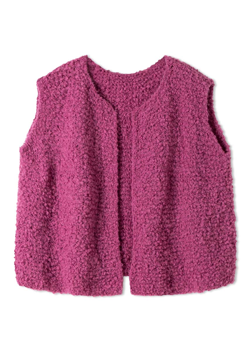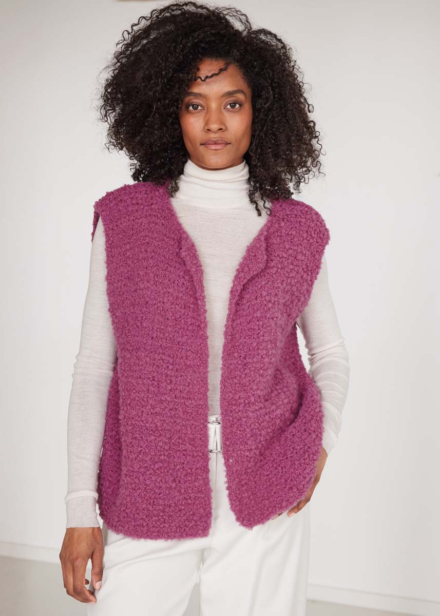Lana Grossa Orsetto (60 % ny ull (merino), 40% alpakka (superfin), løpelengde = ca. 75 m/50 g), 300 (300 - 350 - 350) g i fiolettrosa (farge 4); strikkepinne nr. 8, 1 heklenål nr. 6; 2 maskemarkører (MM).