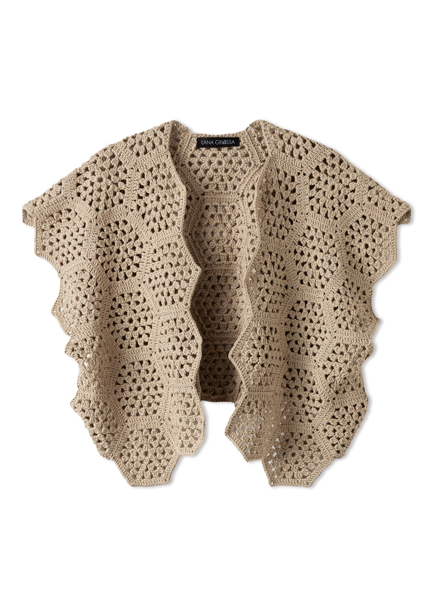 Lana Grossa-kvalitet “Promessa” (70 % bomuld (økologisk), 30 % polyamid (genanvendt), løbelængde ca. 125 m/50 g): ca. 400 til 450 g gråbeige (farve 15), hæklenål nr. 4.
