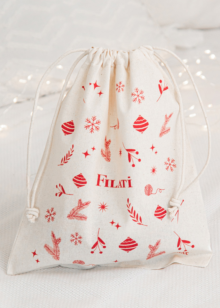 Sættet indeholder to snøreposer: én i klassisk jule-rød med hvidt print og én i naturfarvet bomuld med rødt motiv. Den praktiske snørelukning gør dem nemme at åbne og lukke – ideelle til opbevaring af garn, projekter eller hjemmelavede gaver.